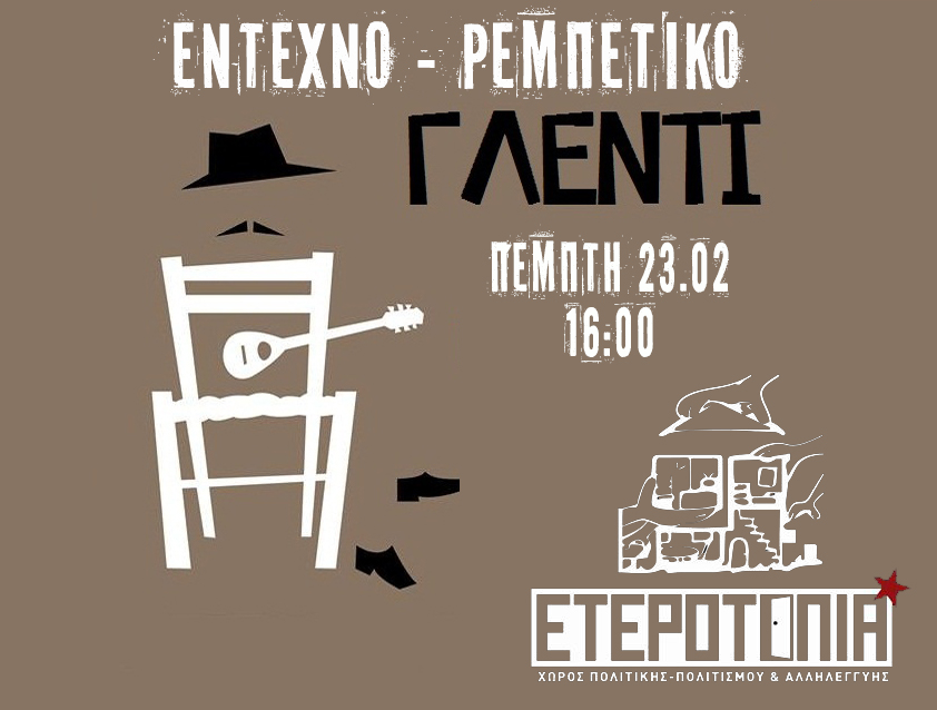 Η ομάδα αλληλεγγύης σε συνεργασία με τις γεύσεις ανατροπής σας καλουν σε ένα όμορφο έντεχνο-ρεμπέτικο γλέντι, την Πέμπτη 23/2 στην ΕΤΕΡΟΤΟΠΙΑ.