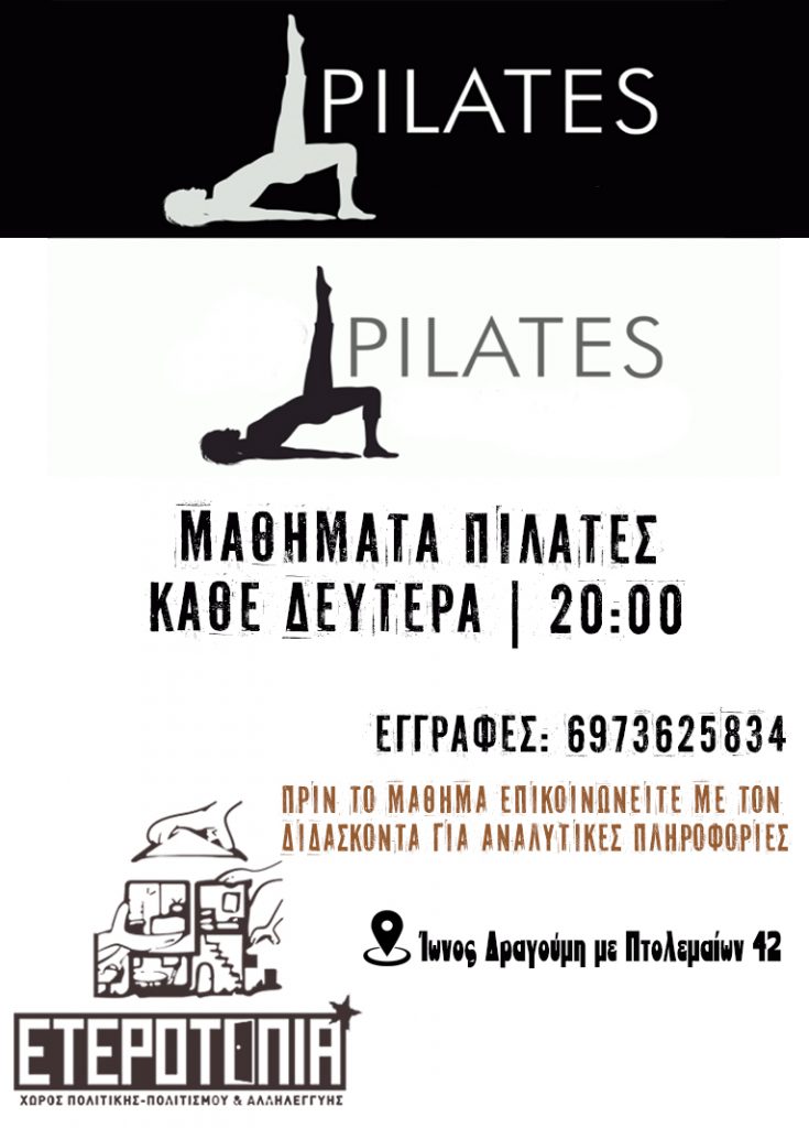 Τα μαθήματα στην ΕΤΕΡΟΤΟΠΙΑ πολλαπλασιάζονται. Από την Δευτέρα 06.03 ξεκινούν δωρεάν μαθήματα ΠΙΛΑΤΕΣ στο χώρο μας.