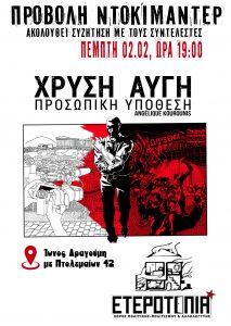 Στα πλαίσια του αντιρατσιστικού αφιερώματος το οποίο θα διαρκέσει ολόκληρο το Φλεβάρη θα πραγματοποιηθεί και προβολή του ντοκιματέρ: Χρυσή Αυγή. Προσωπική Υπόθεση. Την Πέμπτη 2/2 στις 19.00 στην ΕΤΕΡΟΤΟΠΙΑ. Θα ακολουθήσει συζήτηση με τον Λουκά Στάμελλο, συντελεστή του Ντοκιμαντέρ.