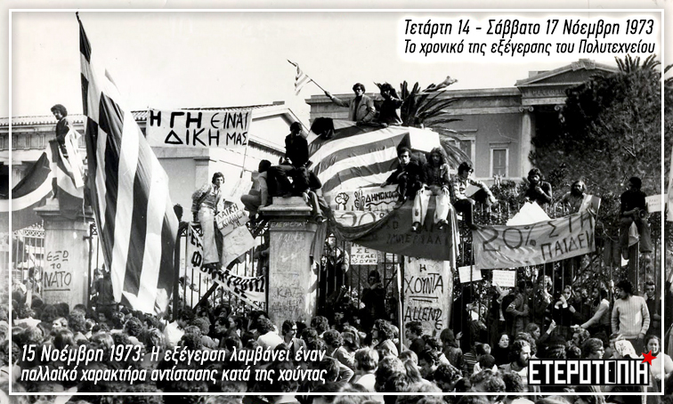 Τα συνθήματα «Έξι χρόνια αρκετά, δεν θα γίνουνε επτά», «Λαέ πεινάς γιατί τους προσκυνάς;» και «Ψωμί, παιδεία, ελευθερία» ηχούν απο άκρη σε άκρη της χώρας. Κυκλοφορεί η Εφημερίδα του ελεύθερου Πολυτεχνείου.