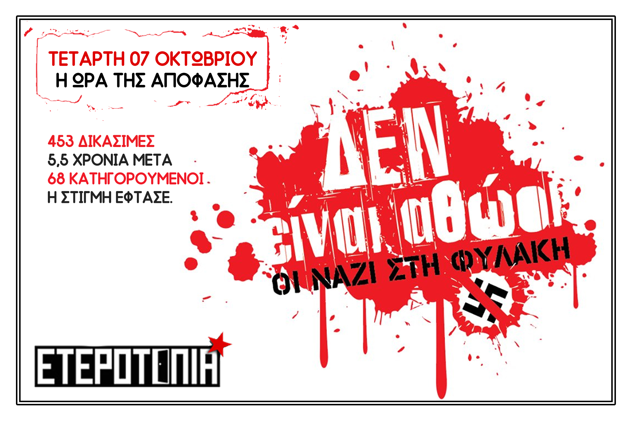 7 Οκτωβρίου 2020 και ώρα 11.00. 7 μαρτυρικά χρόνια από τη δολοφονία του Παύλου, για εμάς η συνολική καταδίκη της ηγεσίας της εγκληματικής οργάνωσης ΧΑ είναι μονόδρομος.