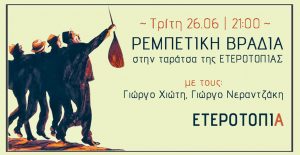 ΠερισσότεραΡεμπέτικη Βραδιά στην Ταράτσα της Ετεροτοπίας | Τρίτη 26.06, 21:00